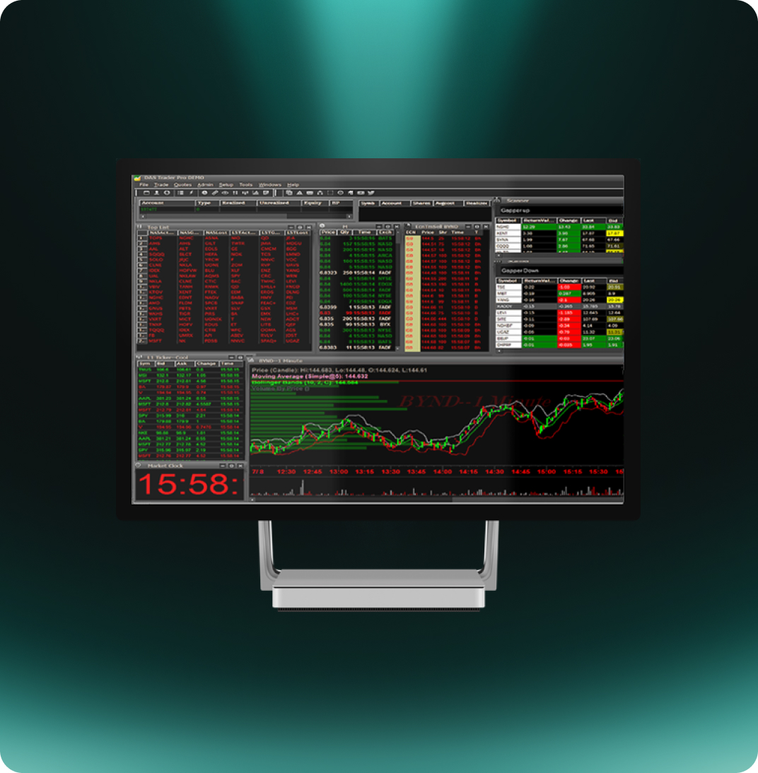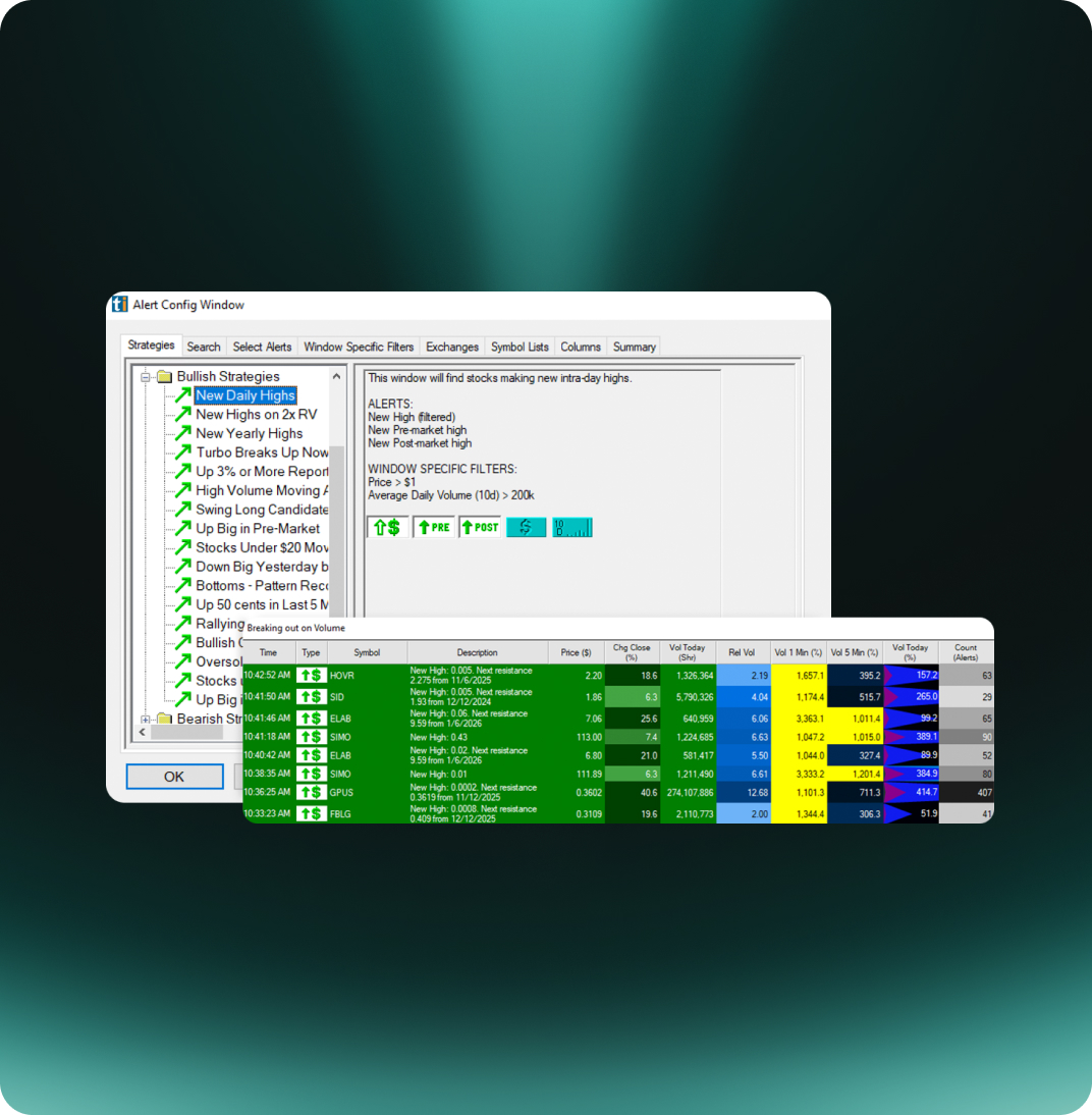 Professional-Grade Market Scanning continuously scans the market using hundreds of customizable conditions, delivering time-stamped visual alerts and optional audible ticker call-outs as activity triggers. Multiple alert windows can run simultaneously, supporting real-time monitoring of different strategies and patterns, and allowing traders to stay aware of fast-moving market action.